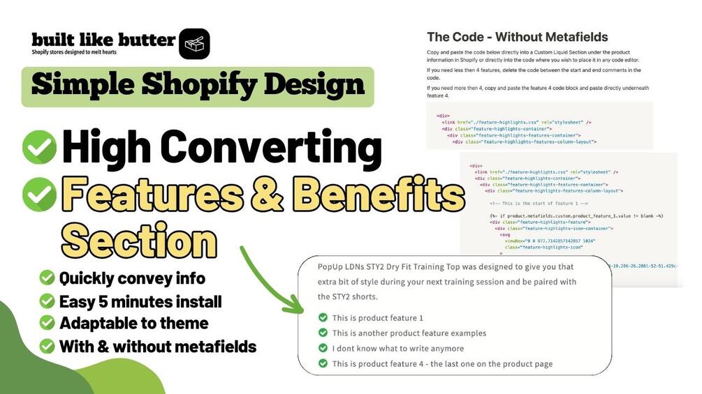 Increases your conversion rate by quickly connecting your potential buyers to the features and benefits of your product as soon as they land on your product page with our mobile first product features block (also looks great on desktops).